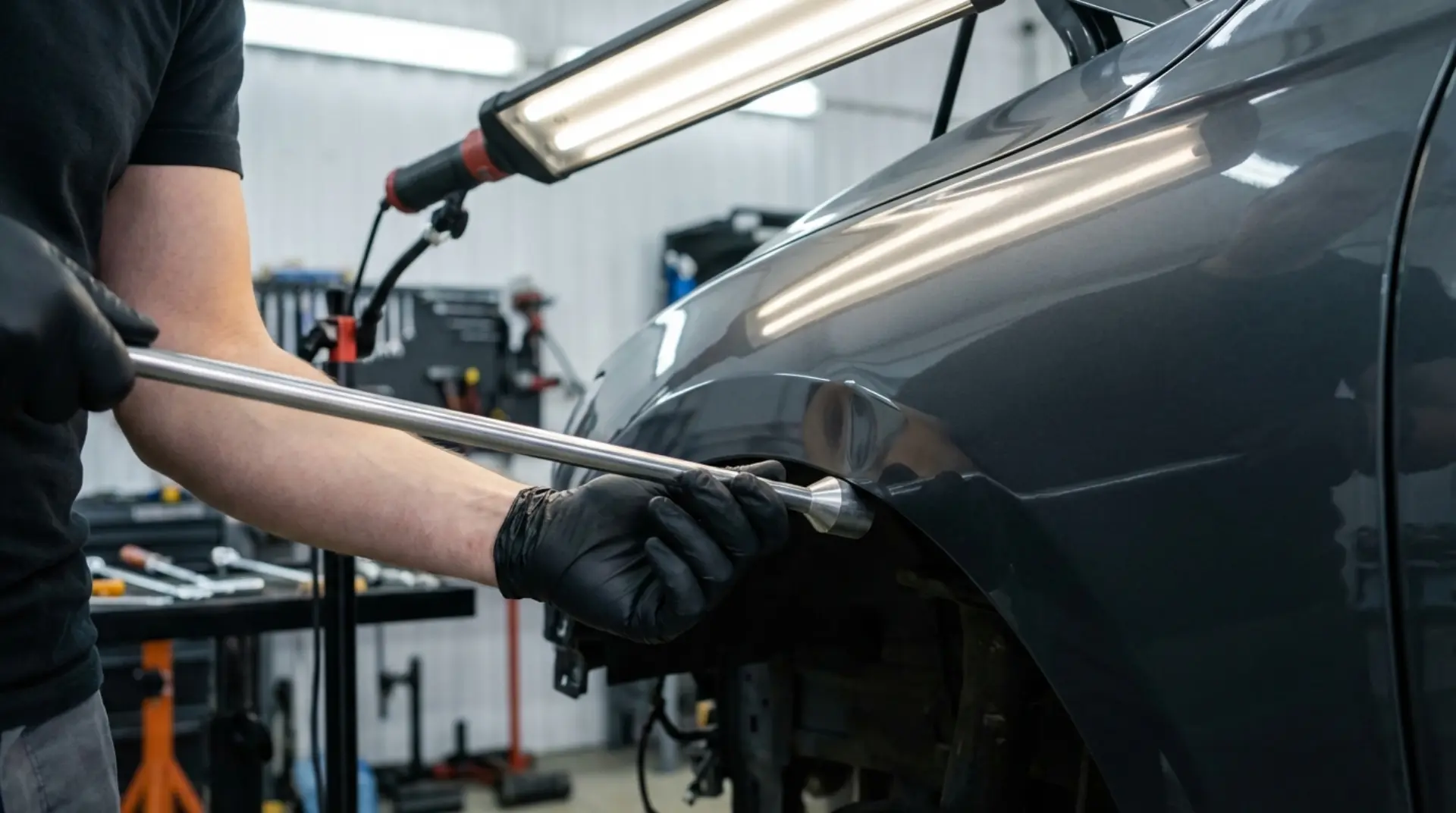 Step 4: Gradual Pressure and Manipulation. This is the core of paintless dent removal. The technician places the tool behind the dent and applies controlled, incremental pressure to push the metal outward. A reflection board or LED light panel is positioned on the surface to reveal the exact contour of the dent in real time. The technician watches the reflection as they work, making micro-adjustments with each push. The process is methodical: push, check, adjust, repeat. Rushing creates high spots that then need to be tapped back down, adding unnecessary time and risk.